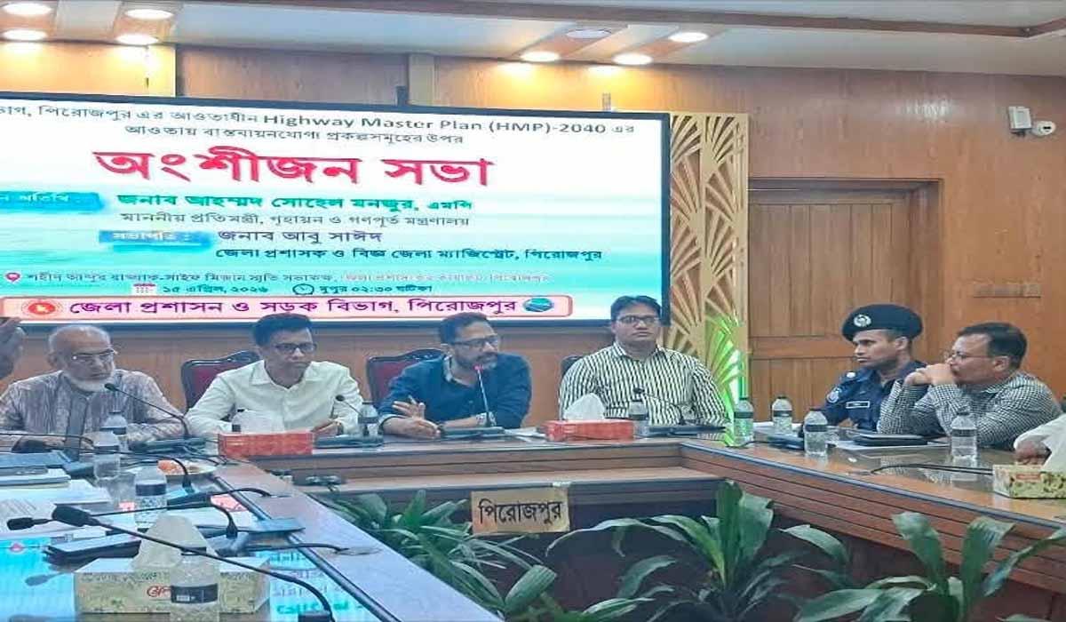 পিরোজপুর জেলা প্রশাসন ও সড়ক বিভাগের যৌথ উদ্যোগে 'Highway Master Plan (HMP)-2040'-এর আওতায় বাস্তবায়নযোগ্য বিভিন্ন প্রকল্পসমূহের ওপর এক গুরুত্বপূর্ণ অংশীজন সভা অনুষ্ঠিত হয়েছে।বুধবার (১৫ এপ্রিল) দুপুরে পিরোজপুর জেলা প্রশাসকের কার্যালয়ের শহীদ আব্দুর রাজ্জাক-সাইফ মিজান স্মৃতি সভাকক্ষে এই সভাটি আয়োজন করা হয়।