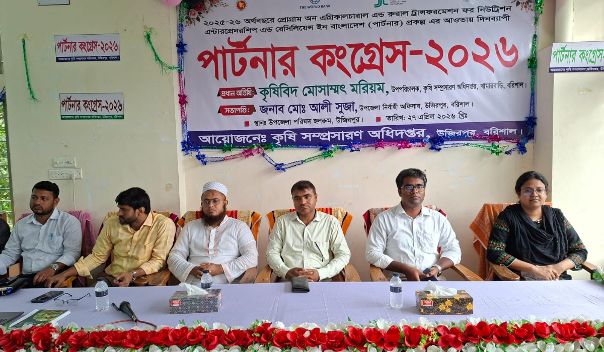 কৃষি উৎপাদন বৃদ্ধি, পুষ্টি নিরাপত্তা নিশ্চিতকরণ এবং গ্রামীণ উদ্যোক্তা তৈরির লক্ষ্যে বরিশালের উজিরপুর উপজেলায় “প্রোগ্রাম অন এগ্রিকালচার অ্যান্ড রুরাল ট্রান্সফরমেশন ফর নিউট্রিশন, এন্টারপ্রেনারশিপ অ্যান্ড রেজিলিয়েন্স ইন বাংলাদেশ (পার্টনার)” প্রকল্পের আওতায় দিনব্যাপী কংগ্রেস অনুষ্ঠিত হয়েছে।